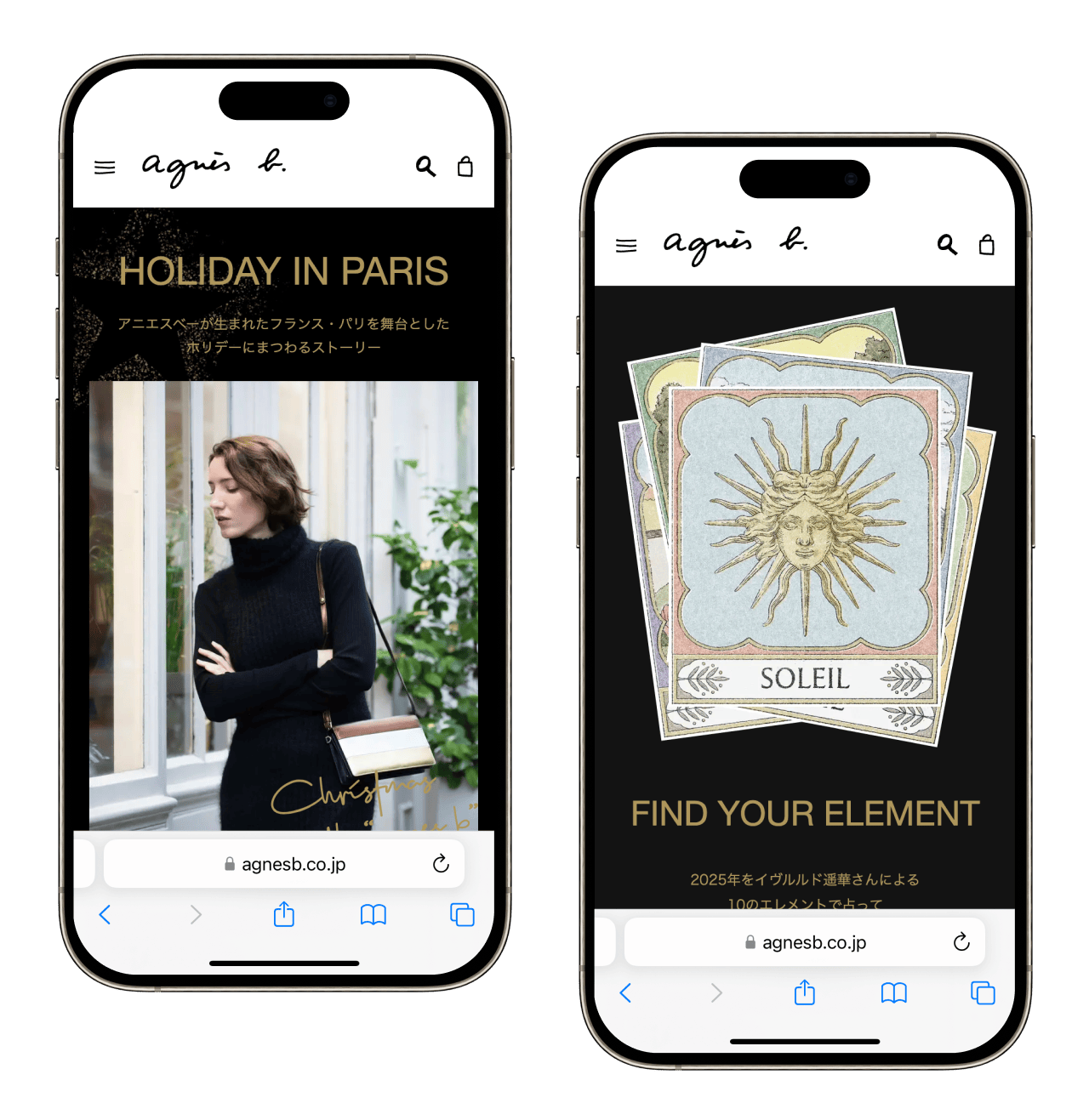 agnes b.の2024年クリスマスキャンペーン「Holiday in Paris」にて、Webサイト、スチール撮影、占いコンテンツ、ダイアリーデザインの制作を担当しました。同キャンペーンでは、5組のキャストによる冬の新作コレクション紹介や、2025年の占いコンテンツなど、多彩なデジタルコンテンツを展開。パリの街並みを舞台に、イルミネーションやツリーで彩られた季節感あふれる世界観を表現し、agnes b.らしい心躍るクリスマスを発信しています。
