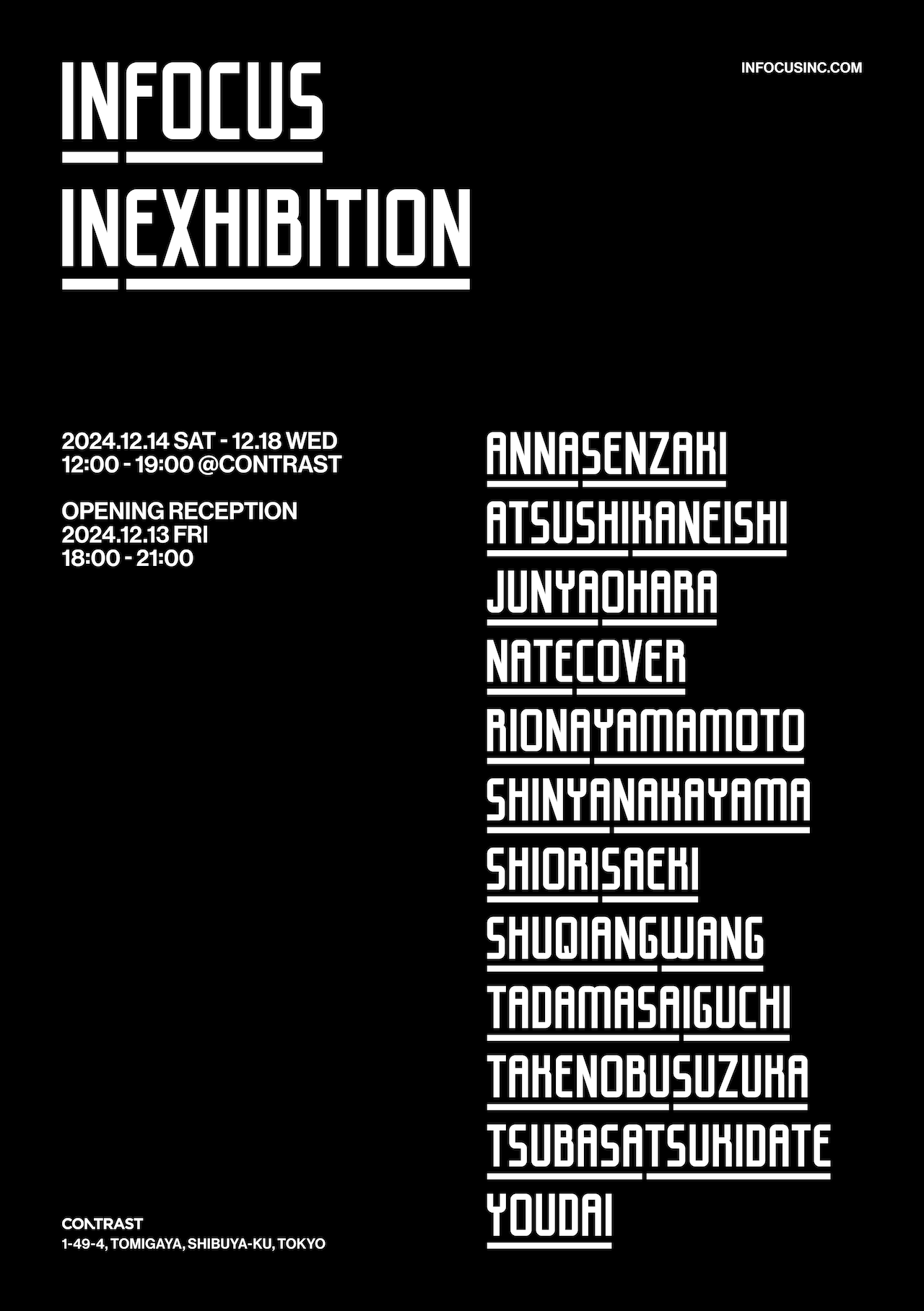 開催場所はIN FOCUSの1Fと地下にあるクリエイティブスタジオ「CONTRAST」。”再構築”をコンセプトに様々なアーティスト達との交流のために立ち上げたスペースでIN FOCUSのメンバーたちがこのテーマに取り組みます。会期中は本展参加メンバーが制作したオリジナルグッズの販売も行います。