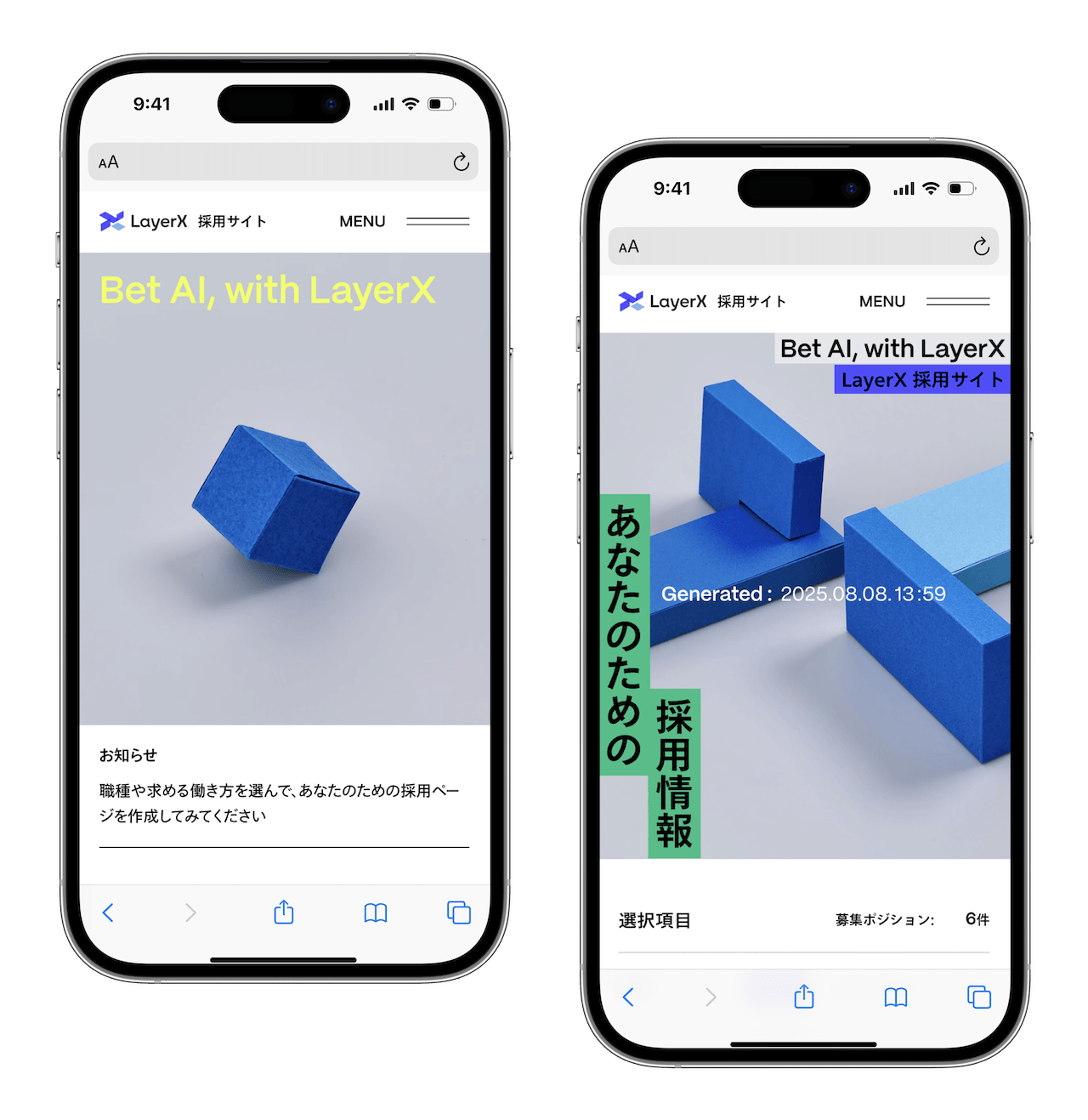 UI面でも、AIサービスを提供する同社らしさを体現。質問に応じて条件に合った採用情報が出力され、毎回異なるヘッダーデザインやグラデーション演出によって、訪れるたびに新鮮でワクワクする体験を目指しました。