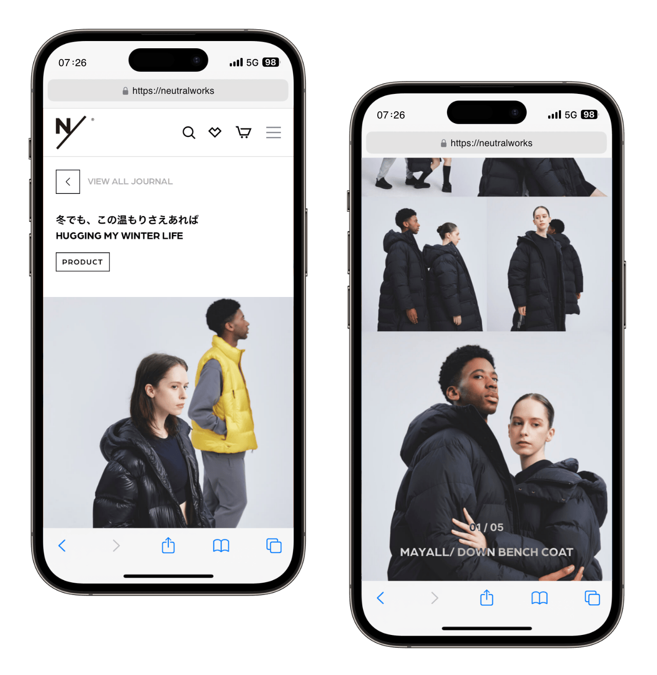 IN FOCUSは、Webサイト内コンテンツのアートディレクション、ライティング、プロダクション、デザインを担当しました。ウエアの重なりと質感にフォーカスして、「ココロとカラダを包み込むアウターの心地よさ」を表現しています。