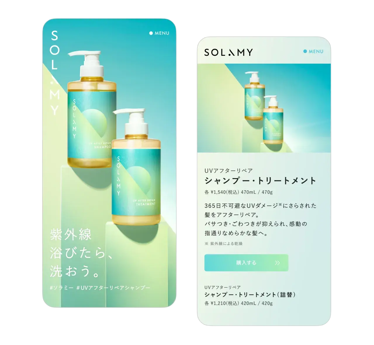 パッケージデザインに合わせた爽やかなブルーとグリーンを基調とした配色と、太陽の光を感じさせるアニメーション演出によって、SOLAMYの世界観を視覚的に表現しています。