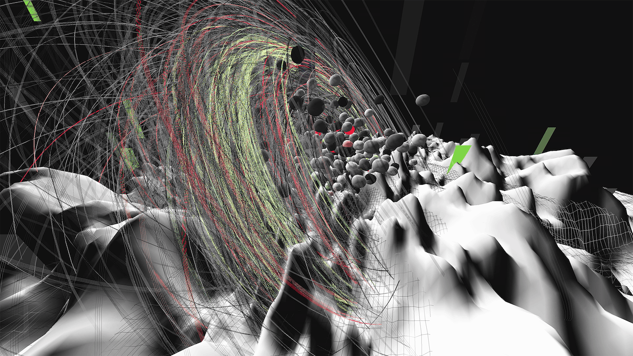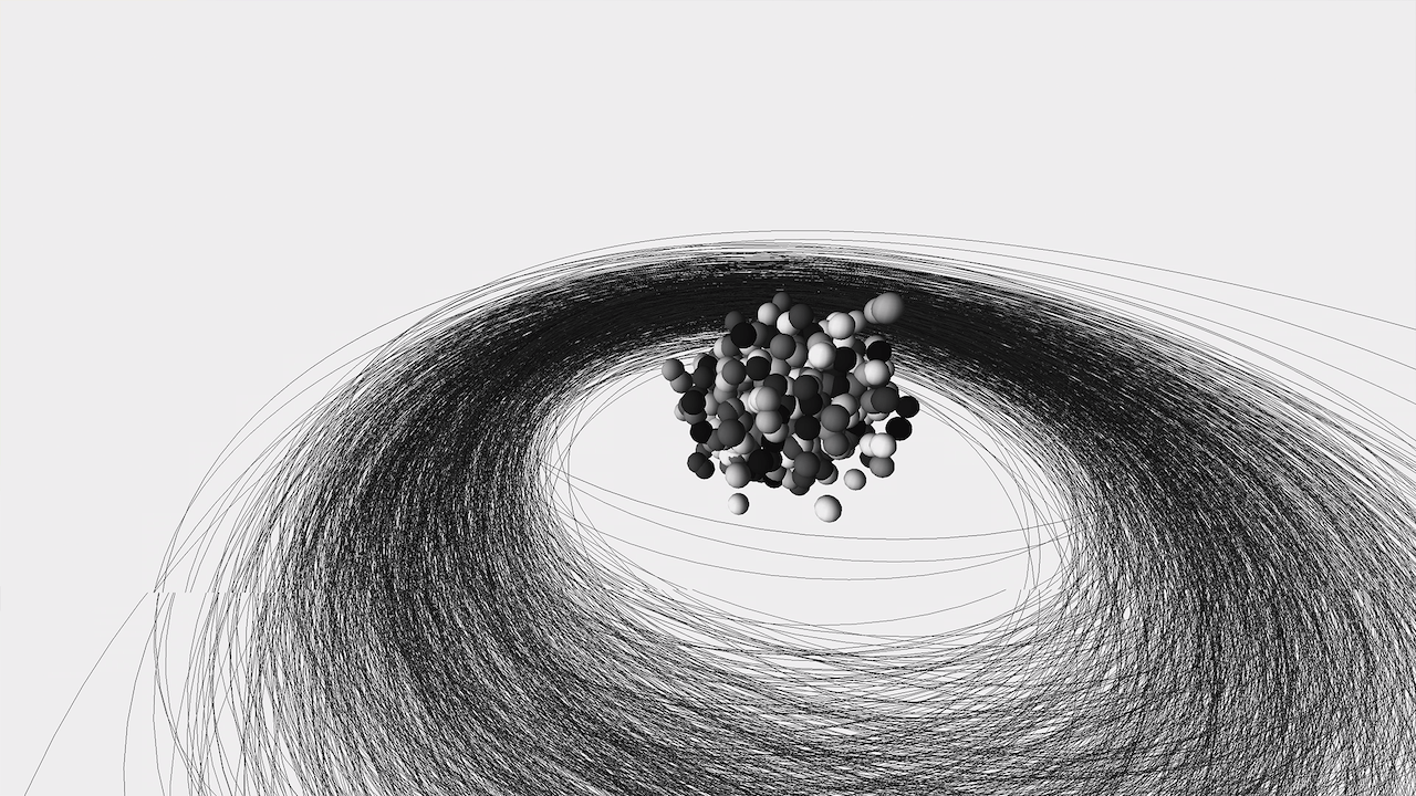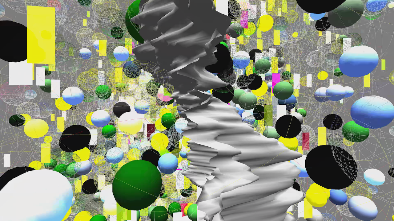 また、それらを通じて制作された作品群では、波状のオブジェクトを粒子システムに組み込んだり波の表面に粒子を散りばめるなど、波と粒子を組み合わせた新たな表現を模索します。音にあわせて部分部分が速く、もしくは遅く動くことにより、視覚と聴覚が連動した非日常的な時間感覚の提供を試みます。
