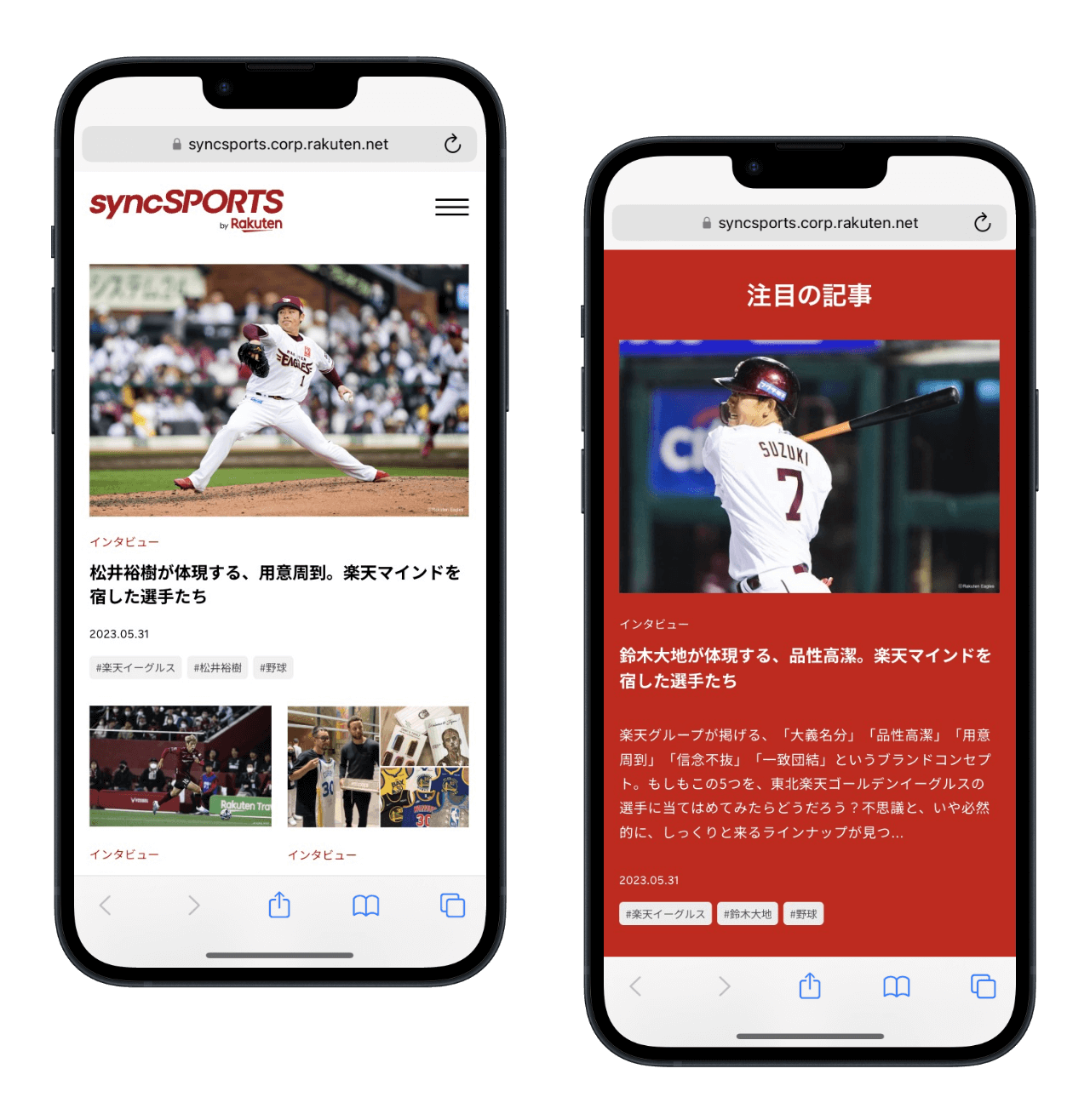同メディアでは、“共感“や”一致“を意味する「sync(シンク)」の名の下、楽天にまつわるアスリートやチームがもたらしてくれる感動や情熱をシェアすることで、読者がそれらをより身近に感じ、前向きになれるコンテンツが発信されていきます。メディアサイトがこれから大きく育っていくことを見据え、拡張性を備えたミニマルなデザインでのスタートになります。ぜひご覧ください。