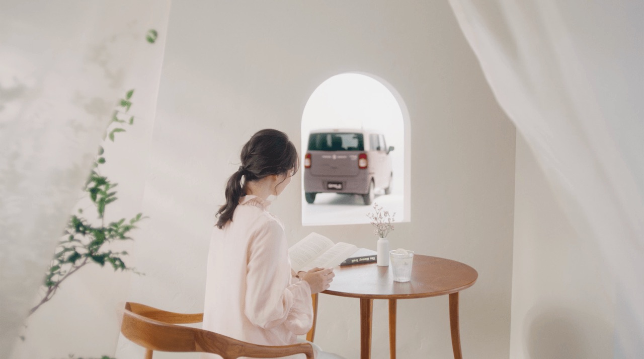 デザインを重視して車を選ぶ若い女性層をターゲットとして、ニュアンスカラーのセットを舞台にかわいい世界観を演出しています。